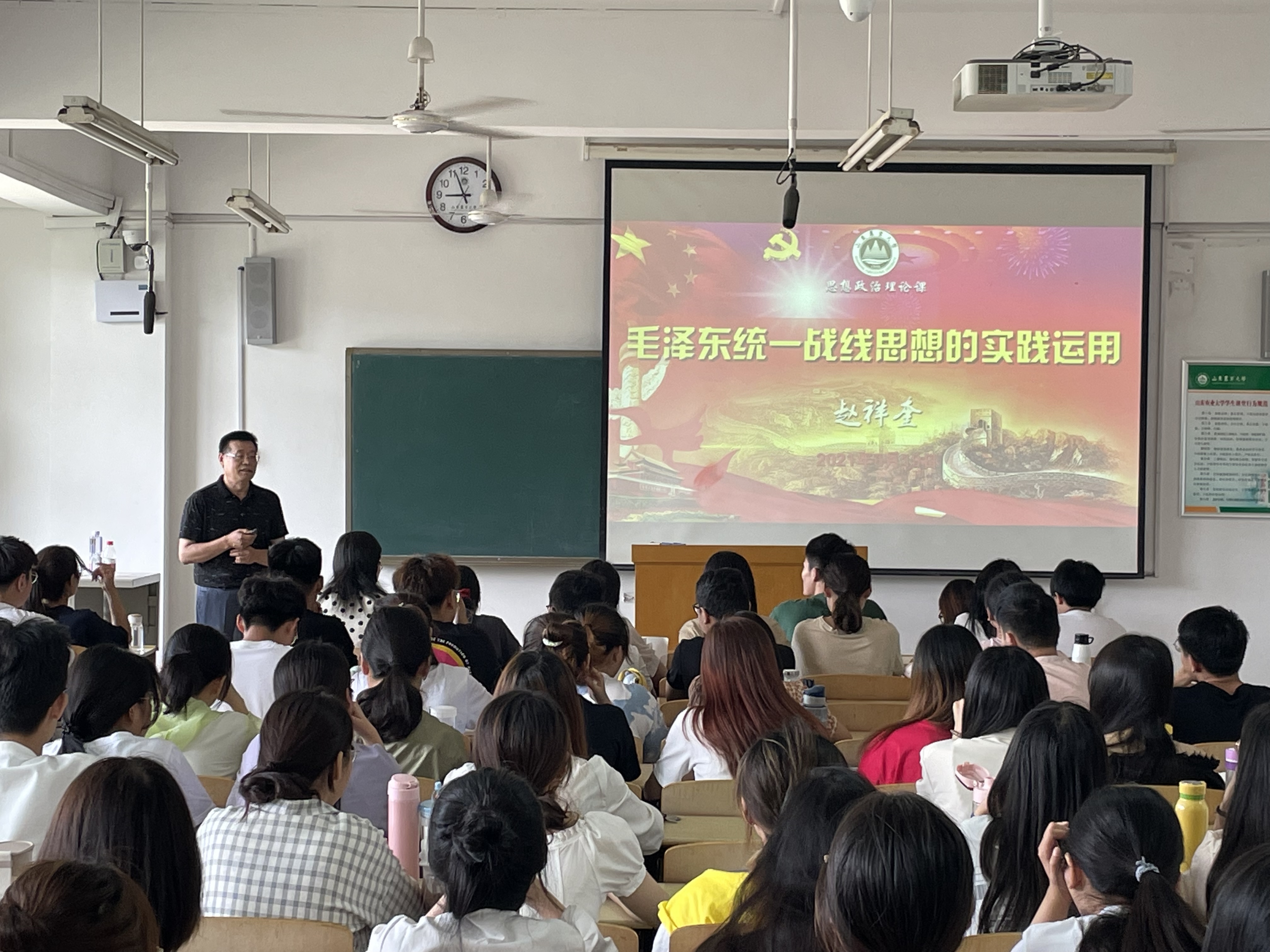 赵祥奎以《毛泽东统一战线思想的实践运用》为题,围绕“第一次国共合作推动中国革命前进步伐”、“第二次国共合作为抗战胜利奠定政治基础”、“抗战胜利后国共第三次合作有名无实,全面内战爆发是必然”、“毛泽东统一战线思想的长远性”和“一国两制的实现彰显统一战线的魅力”五个方面,通过列举生动具体事例,详细分析党的发展历程,阐述了毛泽东统一战线思想的伟大时代意义。