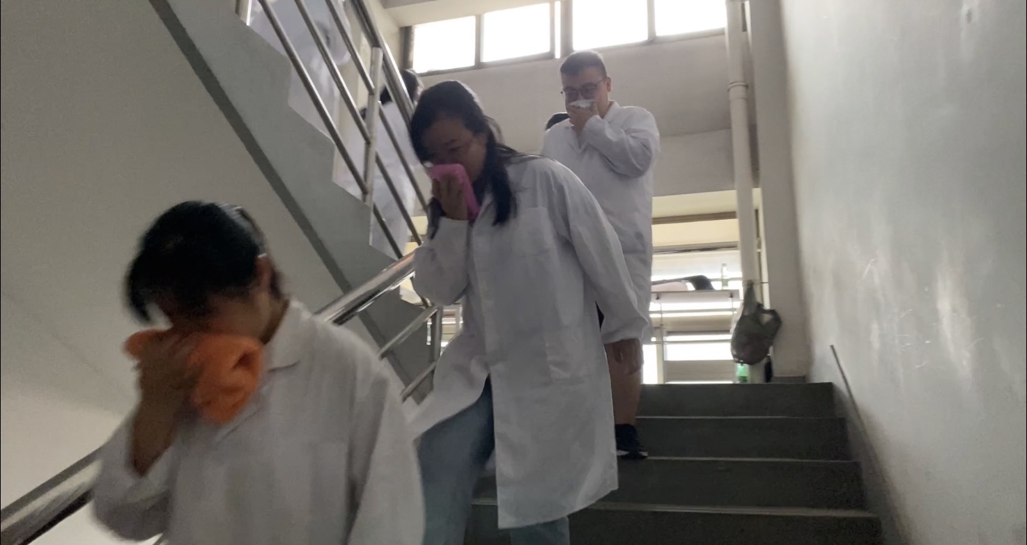 上午9时,消防应急疏散演练正式开始,听到文理大楼紧急疏散广播指令后,5至12楼各个楼层的疏散引导员相继按下火警报警装置,待所在楼层人员撤离后,关闭楼道、楼梯口的防火门。在急促的警报声中,实验室与办公室内的师生按照应急预案,纷纷用湿手帕捂住口鼻,弯着腰,在疏散引导员的指挥下从指定的楼梯通道快速、有序地撤离到文理大楼前的安全开阔地带。经过集合清点人数后,所有参与演习人员全部安全撤离到达指定位置,整个过程用时3分53秒,做到了安全、快速、有序。