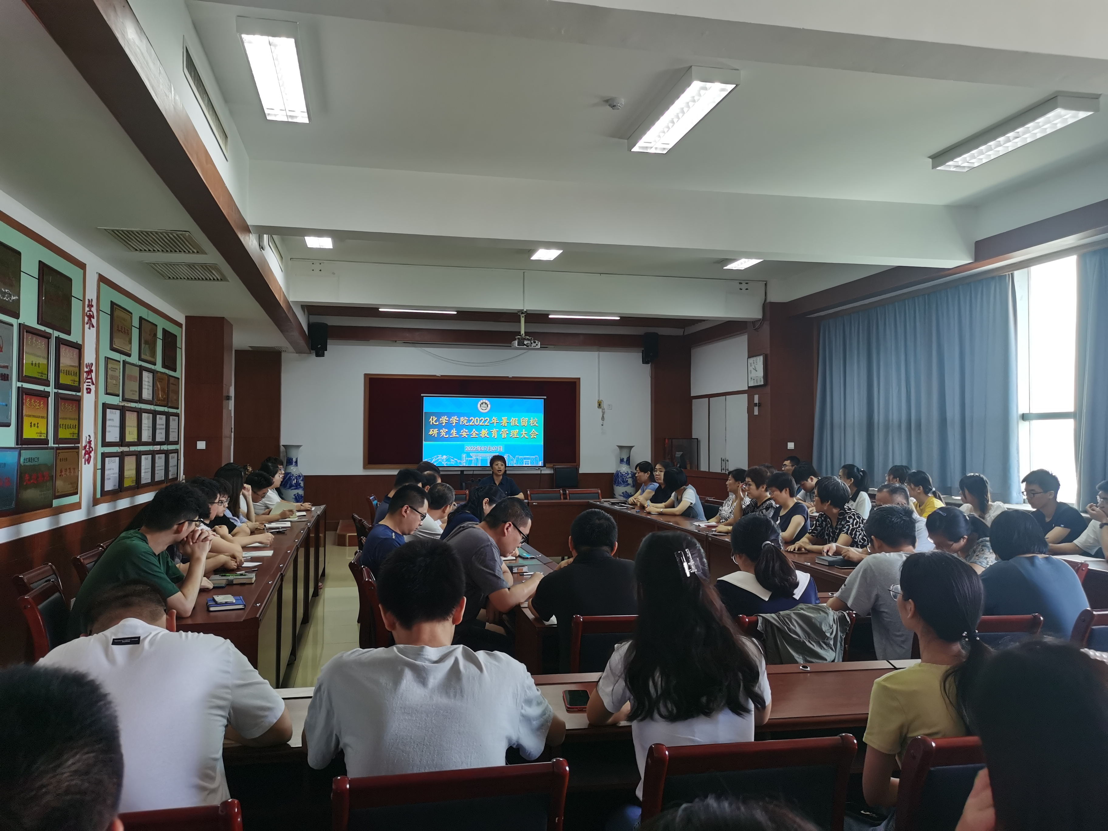 为切实做好暑期留校研究生的安全教育工作,落实学校防疫防控管理要求,提高留校研究生的安全防范意识,7月7日,化学学院于文理大楼811召开“2022年暑假研究生安全教育管理大会”,全体导师和全体留校研究生参加。
